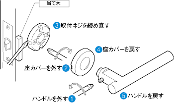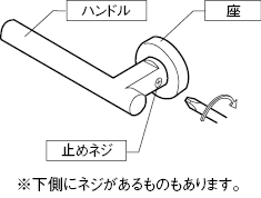 - 3ハンドルを仮に差込み、正常に動く事を確認しながら、座の取付ネジを手回しのプラスドライバーで充分に締め直します。(座や扉が変形するほど締め付け過ぎないようご注意ください)