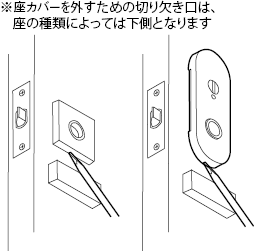 - 2座カバーの切り欠き口にマイナスドライバー等を差込み、座カバーを外します。(當て木等を使ってドアにキズを付けないようご注意ください)