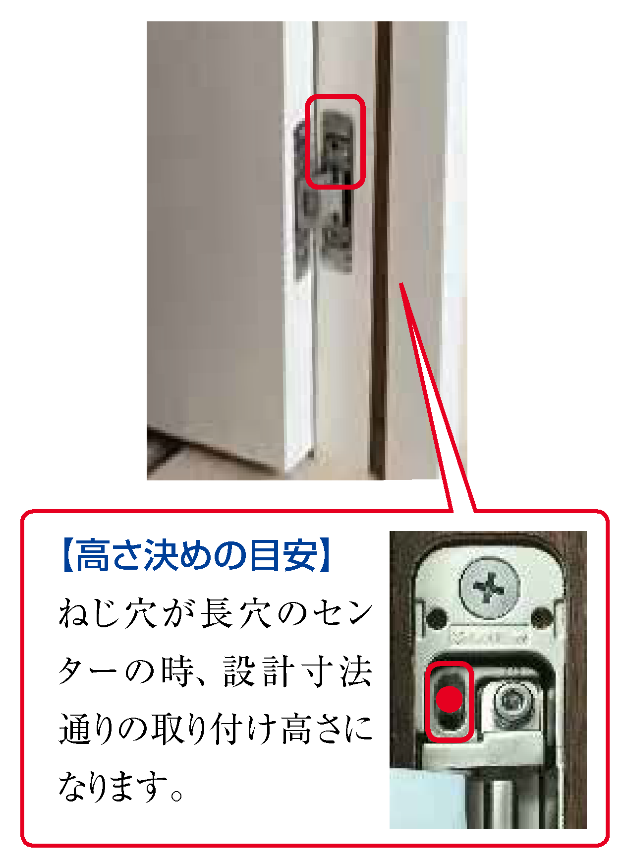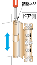 - ■この蝶番は、下蝶番にてドア重量を支えていますので、重い扉等の場合の調整時にはまくら木等でドアを浮かし気味にて行ってください。