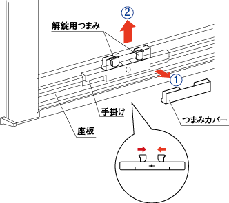 - 1レバーを解錠の方向に倒しながらシャッター幅木を少し持ち上げると解錠します。