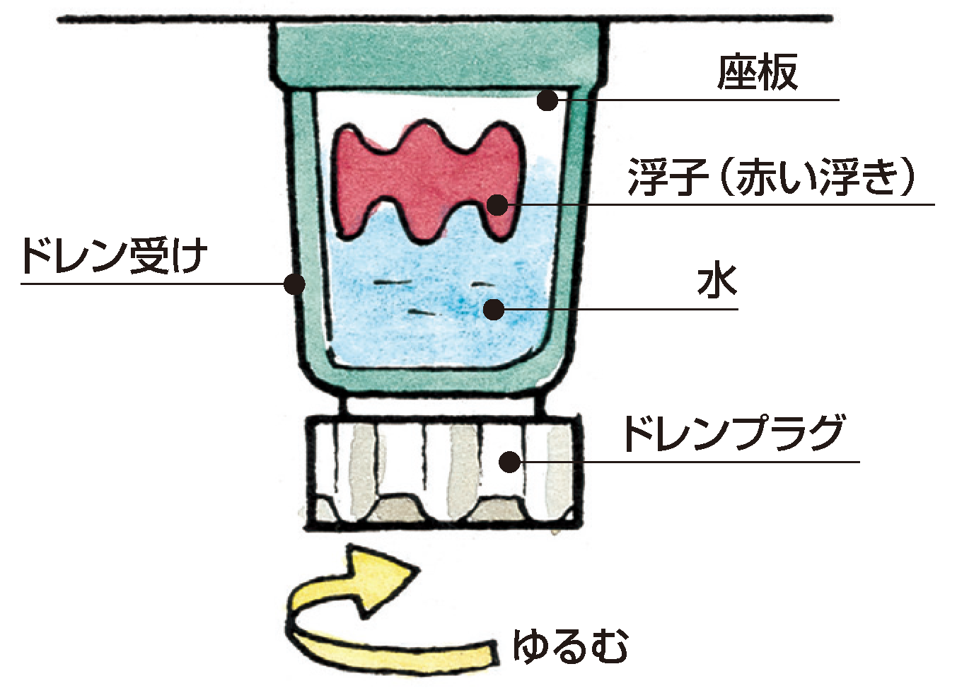 - 1ドレンプラグを回してゆるめ浮子(赤い浮き)が沈むまで水を抜きましょう。