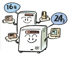 16號や24號など、ガス給湯器には、給湯能力の大きさをあらわす呼稱がつけられています。號數の數値は、「給水溫度より25度高いお湯の出力湯量」を表現。たとえば16號の給湯器なら、水溫15度のときに40度の湯を毎分16?使用できます。