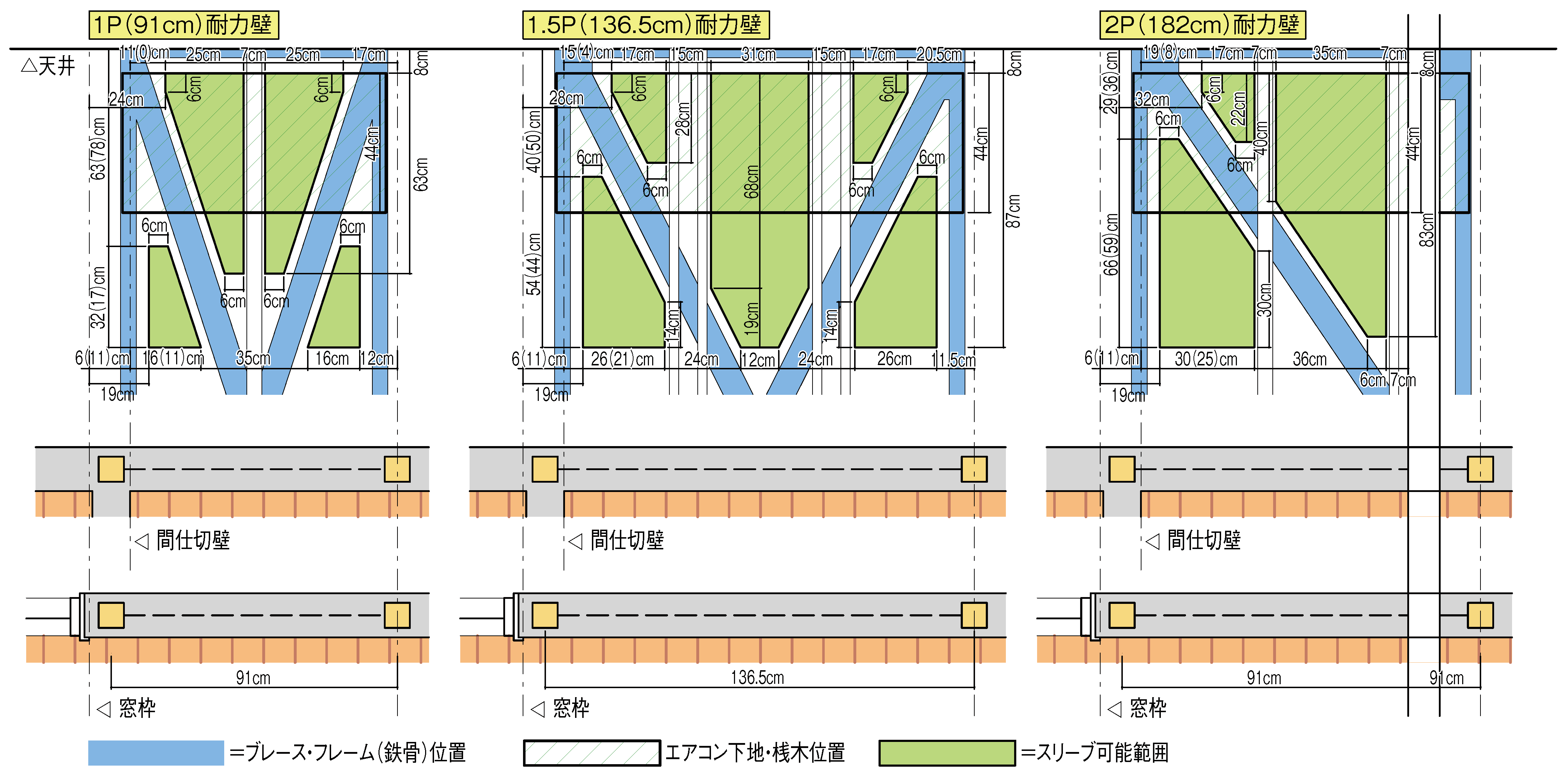 壁掛けタイプのエアコンは、石膏ボードの強度の問題がありますので、必ず「壁補強下地」のあるところへ取り付けてください。「壁補強下地」の位置については、施工図面をご參照ください。また、外壁にスリーブ(穴)をあける際、場合により構造上大切なブレースやフレーム(鉄骨)を傷めてしまうこともあります。また、外壁の內側に通っているガスや給排水の配管、電気の配線などを誤って傷つけてしまうと大変危険です。また、引戸?雨戸などの外裝材に干渉する場合があります。配管や配線外裝材などの位置をご確認ください。
