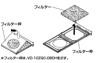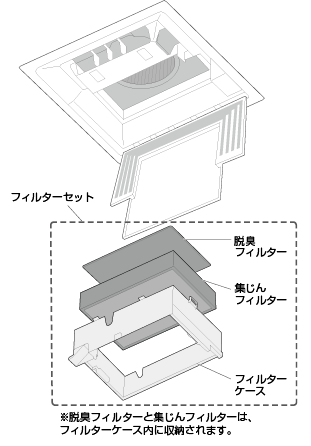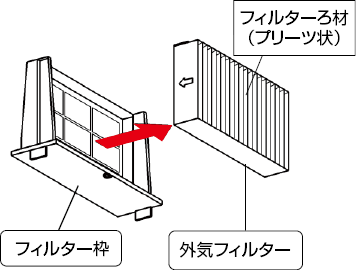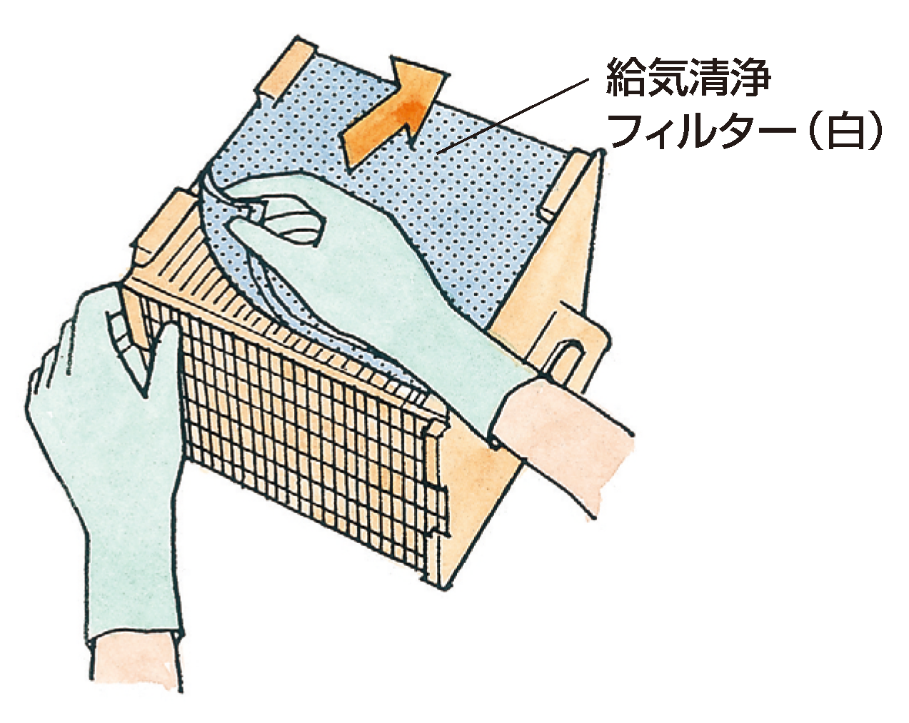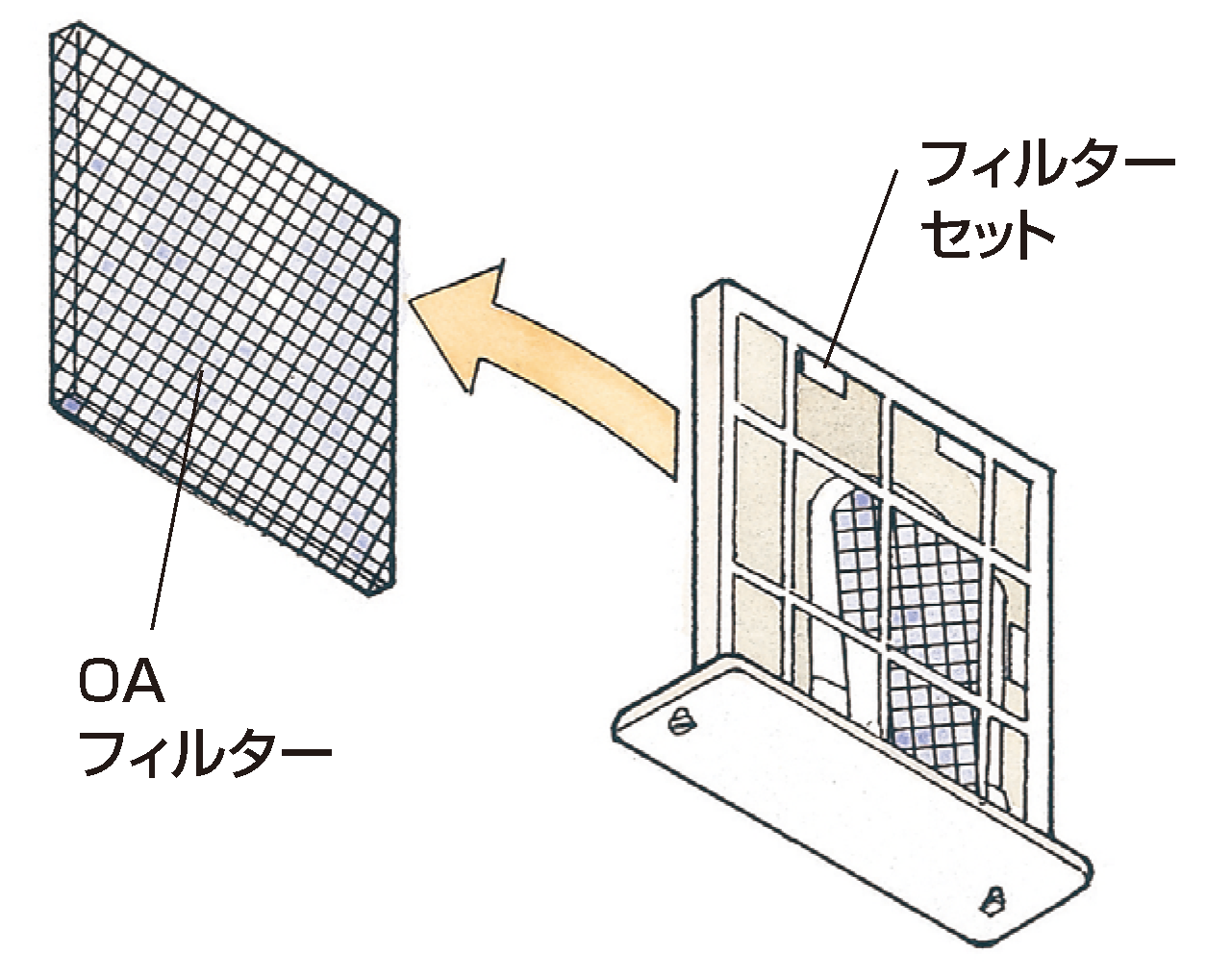 • フィルターにほこりが付著すると、風量低下や異常音発生の原因となりますので、約3ヶ月に1度を目安としてフィルターの清掃をしてください。また、約1年に1度を目安としてフィルターを交換してください。