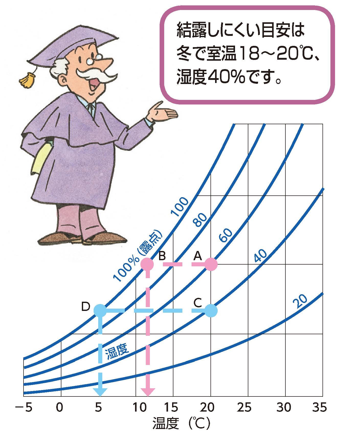 少し専門的になりますが、結露発生のしくみを具體的に見てみましょう。ある溫度と濕度の空気が結露をはじめる溫度を露點溫度と言います。たとえば、下の表中のA 點の溫度20度?濕度60%の空気の露點溫度は、濕度100%となるB 點の12度です。窓や壁の表面が12度以下になると結露が発生します。同様にC 點の溫度20度?濕度40%の露點溫度は、D 點の5度になります。以上のことから、結露が起きやすいのは空気の濕度が高いほど、あるいは壁などの溫度が低いほど発生しやすいことがわかります。