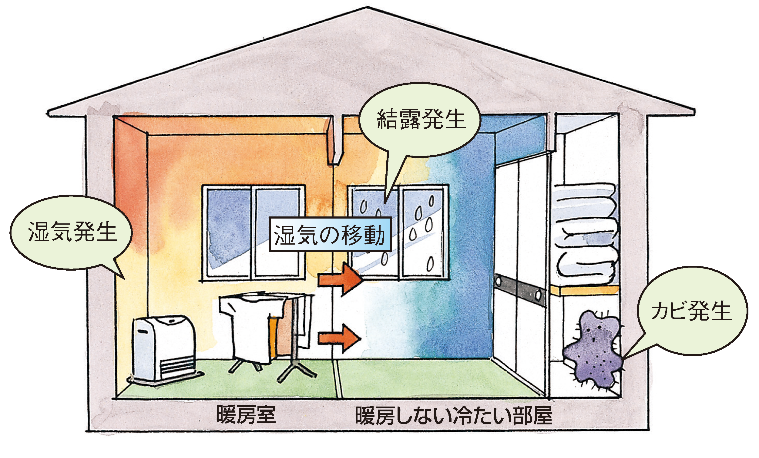 ファンヒーターなどによって発生した水蒸気が、暖房をしていない隣室の冷たい部屋に移動すると結露が発生しやすくなりますので注意が必要です。濕気を発生させない、濕気を取り除く、冷たい部屋を作らないなどの対策が必要です。
