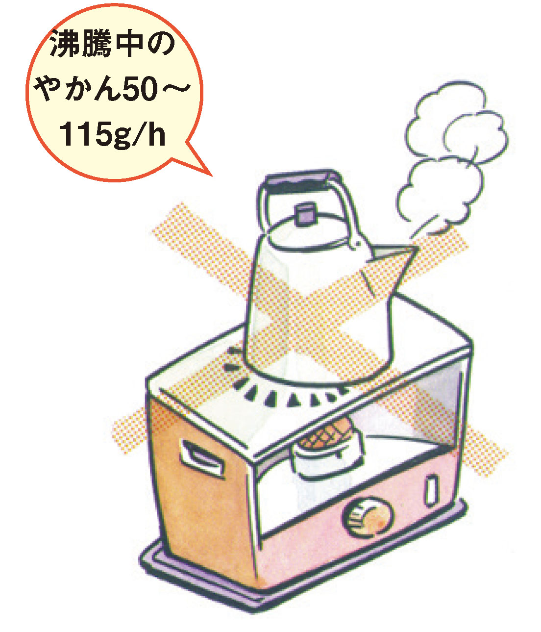 • 開放型ストーブはなるべく用いないでください。また、ストーブにやかんなどをのせておかないようにしましょう。