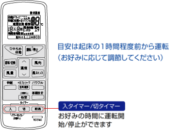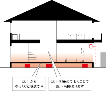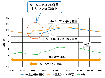 シーズンのはじめ(床下暖房のつけはじめ)は、まず床下から徐々に暖めるため、床下暖房を運転してからお部屋が暖まるまでに、數日間かかる場合がありますので、寒くなる前に予め運転しておくことをお勧めします。また、急に寒さが厳しくなった場合など、必要に応じてルームエアコンをご活用ください。厳寒期には朝の室溫がやや低くなることがあります。このような場合、ルームエアコンのタイマー運転を活用することで朝の室溫が向上します。