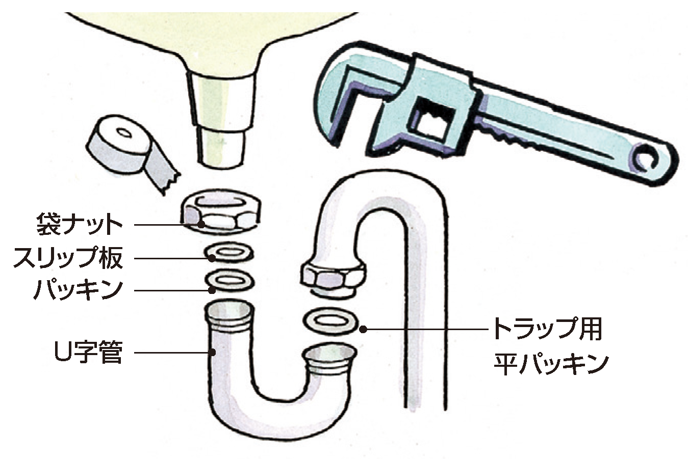 洗面臺の下にある排水トラップがS字狀の場合は、この部分に異物が溜まります。モンキーレンチでナットをゆるめ、トラップを外して落としたものを取り出します。中に水が溜まっていますので、下に洗面器などを置いて受けましょう。またパッキンなどをなくさないよう注意してください。
