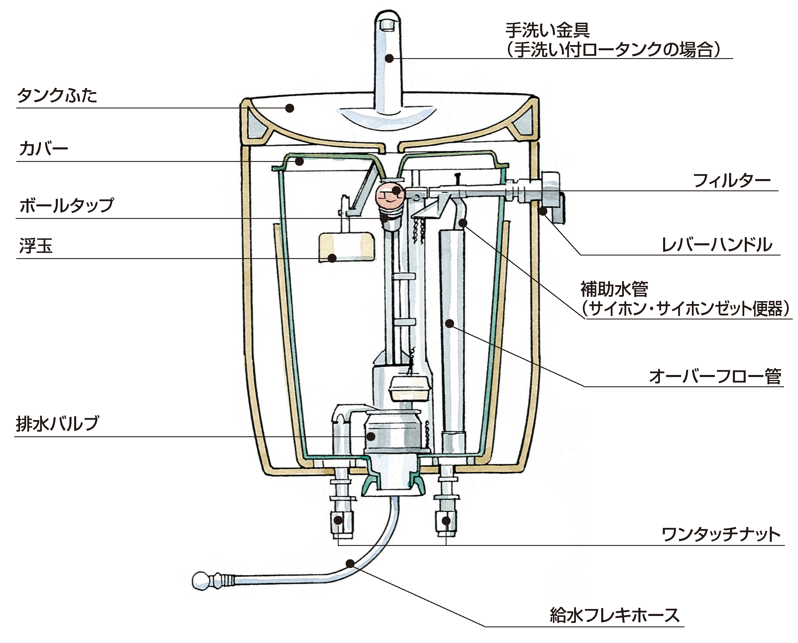 水が止まらない原因は、ボールタップ(水の取り入れ口)か、排水金具の排水バルブ(水の出口)のどちらかに、異常があると考えられます。ボールタップは、タンク內(nèi)に取り入れる水が満水になった時、浮き玉が上がって水の流入を止める裝置。一方、タンク外側(cè)からのレバー操作によって、排水金具の排水バルブを持ち上げ、排水口を開放にして水を流すのが排水バルブです。止水栓を開閉することで原因を探しましょう。