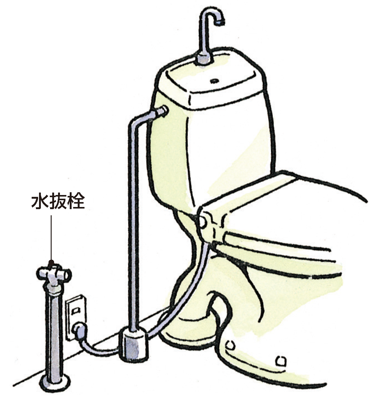 水抜栓を操作し、タンクへの給水を止めてください。洗浄ハンドルを回して水を流し、タンクと配管內(nèi)を空にして凍結(jié)を防止します。