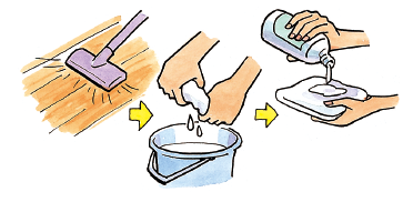 掃除機をかけたあとに、中性か弱アルカリ性の住宅用洗剤を含ませた雑巾で汚れを拭き取ります。その後、洗剤分をとるために固くしぼった雑巾で水拭き。よく乾かしてから、最後に樹脂ワックスを塗ってください。
