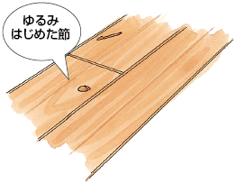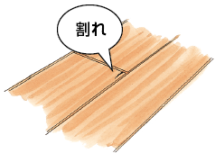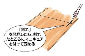 竹は、木材と同様植物繊維が固まってできており、全體としては固い素材ですが、「竹を割ったような…」とたとえられるように、端に強い力が加わると縦方向に割れる性質があります。フローリングのように平面に張り並べて使う場合、フローリングの「角」に固いものが當たると數ミリ程度の割れが入ることがあります。また、陽當たりのよい場所や暖房設備の使用による乾燥により繊維が割けてくる場合があります。放置しておきますと、割れが延びてささくれる原因にもなりますので発見したら早めに処置しましょう。