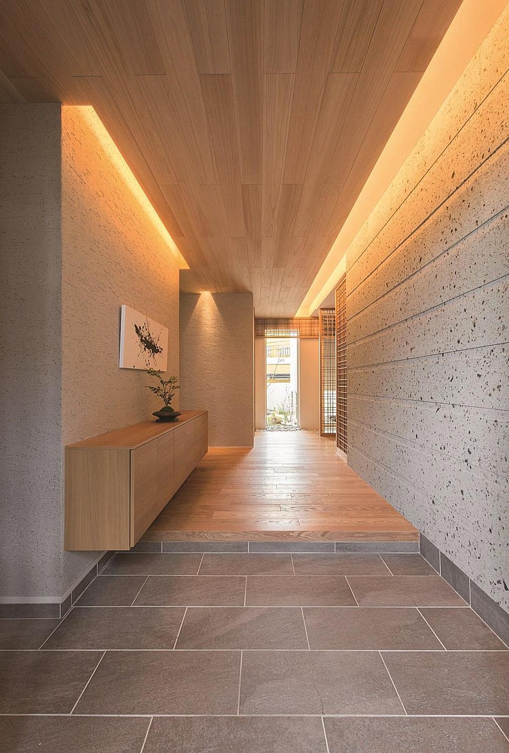 ​「酒都西條」の伝統的な街並みにも溶け込むどこか懐かしい和モダンな外観と床を下げることで開放的な空間を演出する「ロースタイルリビング」 繰り返しの地震にも耐える最新のテクノロジーとの融合を、東広島展示場にてご體感ください。