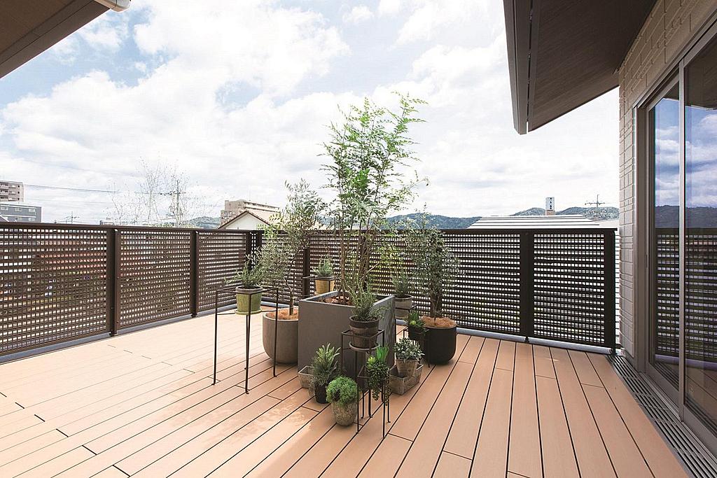 ロースタイルリビングとつながるウッドデッキは視覚的な広がりを演出