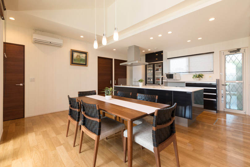 ウォルナットのダイニングテーブルが落ち著きと品格を醸し出すダイニングキッチン。奧の扉はご夫妻それぞれの個(gè)室と、その間にあるウォークインクローゼットにつながっています。「プランを見た時(shí)にワクワクした気持ちのまま過ごしています。大満足の家です」とご夫妻