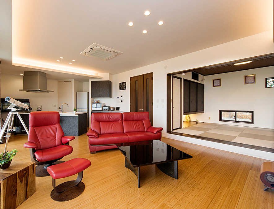 バンブー材のフローリングがリゾート感を醸し出すリビング。2m72cmの高い天井に組み込んだ間接照明がやさしい光で彩ります。続きにしつらえた小上がりの和室ともしっくりと調和しています。