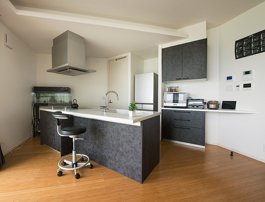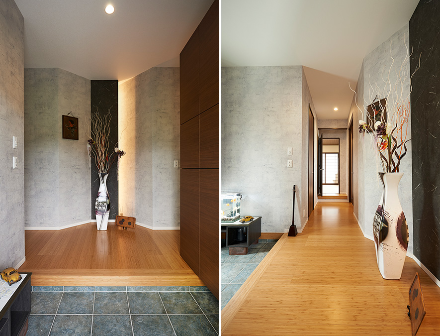 キッチンの斜め壁を玄関ホール側の演出にもうまく生かし、正面壁に角度をつけて表情豊かなデザインに。黒のアクセント壁から漏れる間接照明の美しい燈りが、コンクリート調の壁に溫もりを添えています。玄関から直接和室へとつながる動線も便利。