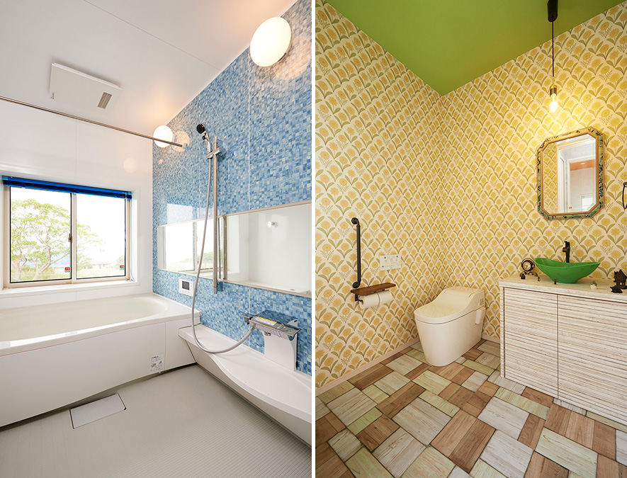 広いトイレ空間はひまわり柄の壁、グリーンの天井、ウッドタイル調の床で遊び心たっぷりの楽しい雰囲気に演出。ソラマメのような手洗いボウルが愛らしいアクセントになっています。海の見える浴室は、壁パネルもブルーで海のイメージに。