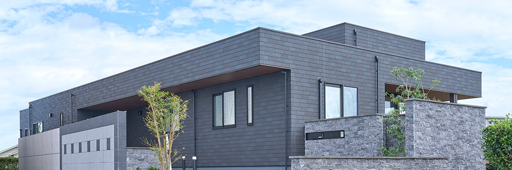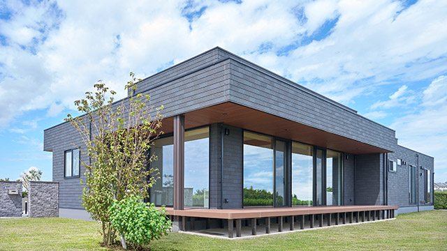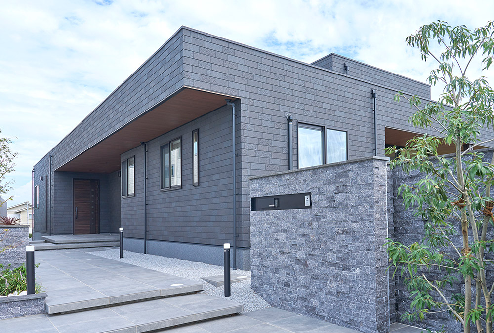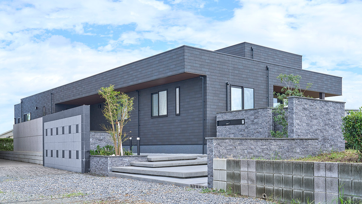 グレーを基調(diào)としたスタイリッシュな平屋。水平ラインが美しい端正なフォルムに、L字型に張り出した軒や內(nèi)部空間を活かした凹凸感を加えることで、飽きのこない印象的な造形美に仕上げました。木目調(diào)の軒裏が溫もりを添え、伸びやかな大開(kāi)口が奧行きのある表情を生み出しています。