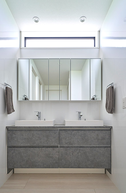 白を基調(diào)とした清潔感あふれる洗面スペース。ダブルボウルを設(shè)けたことで、慌ただしい朝でもスムーズに身支度が整います。上部の開(kāi)口部からは心地よい光が差し込み、爽やかな朝の時(shí)間を演出します。