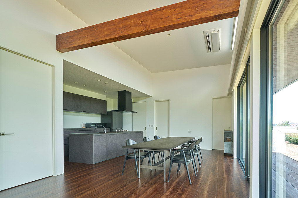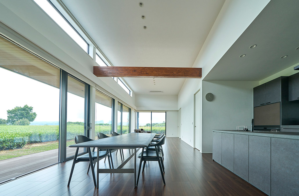 白を基調(diào)とした空間に、あらわし梁とウォルナットの木床が木の溫もりを添えるダイニング。あらわし梁が描く水平ラインは空間にリズムを生み出すとともに、家族の愛(ài)著を育みます。アイランドキッチンに立てば、視線の先には大開(kāi)口から茶畑が広がり、開(kāi)放感を味わいながら調(diào)理を楽しめます。