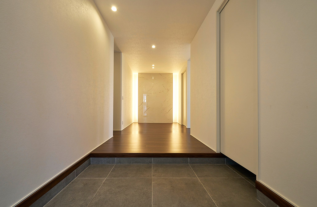 グレーベースの外観から一転、玄関ホールは白を基調(diào)とした靜謐な空間に。間接照明で浮かび上がる正面のタイル壁面が視線を惹き込み、室內(nèi)への期待を高めます。余計(jì)なものを削ぎ落とし、あえて開(kāi)口部を設(shè)けないことで、リビングに入った瞬間の開(kāi)放感を際立たせます。