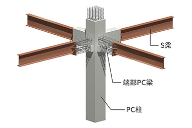軀體の軽量化と高耐久性を実現する、梁の中央部を鉄骨造、材端部をPC造とした混合構造技術