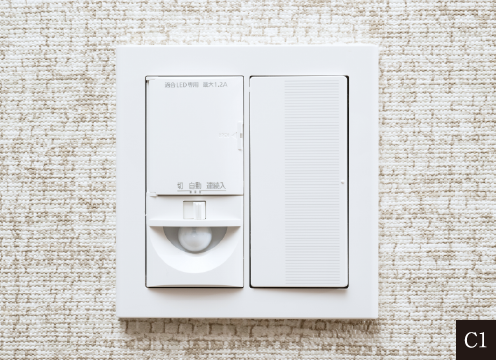 - 人などが動いたときの溫度変化を検知して自動點燈?消燈するセンサ付スイッチを玄関に採用しました。夜の帰宅時など、暗くなりがちな玄関をスイッチ操作すること無く點燈することができます。