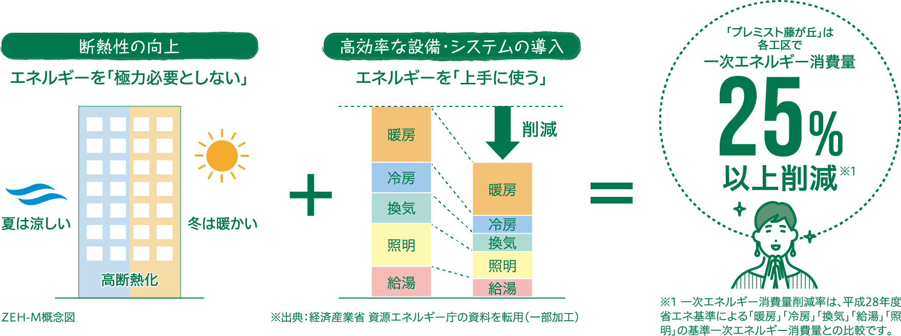 集合住宅におけるZEHには、ZEH-M、Nearly ZEH-M、ZEH-M Ready、ZEH-M Orientedの4つがあり、プレミスト藤が丘はZEH-M Orientedに該當(dāng)します。※ZEH-M Oriented:全住戸で強(qiáng)化外皮基準(zhǔn)に適合し、再生可能エネルギー等を除き、共用部を含む當(dāng)該住棟全體で、基準(zhǔn)一次エネルギー消費(fèi)量から20%以上の一次エネルギー消費(fèi)量を削減した集合住宅