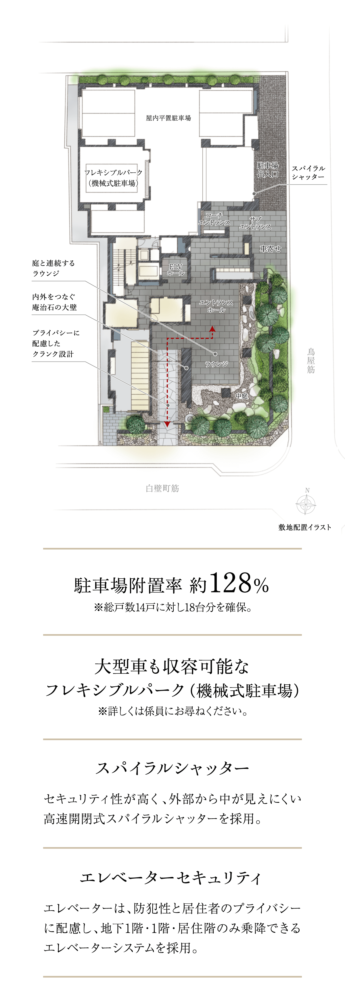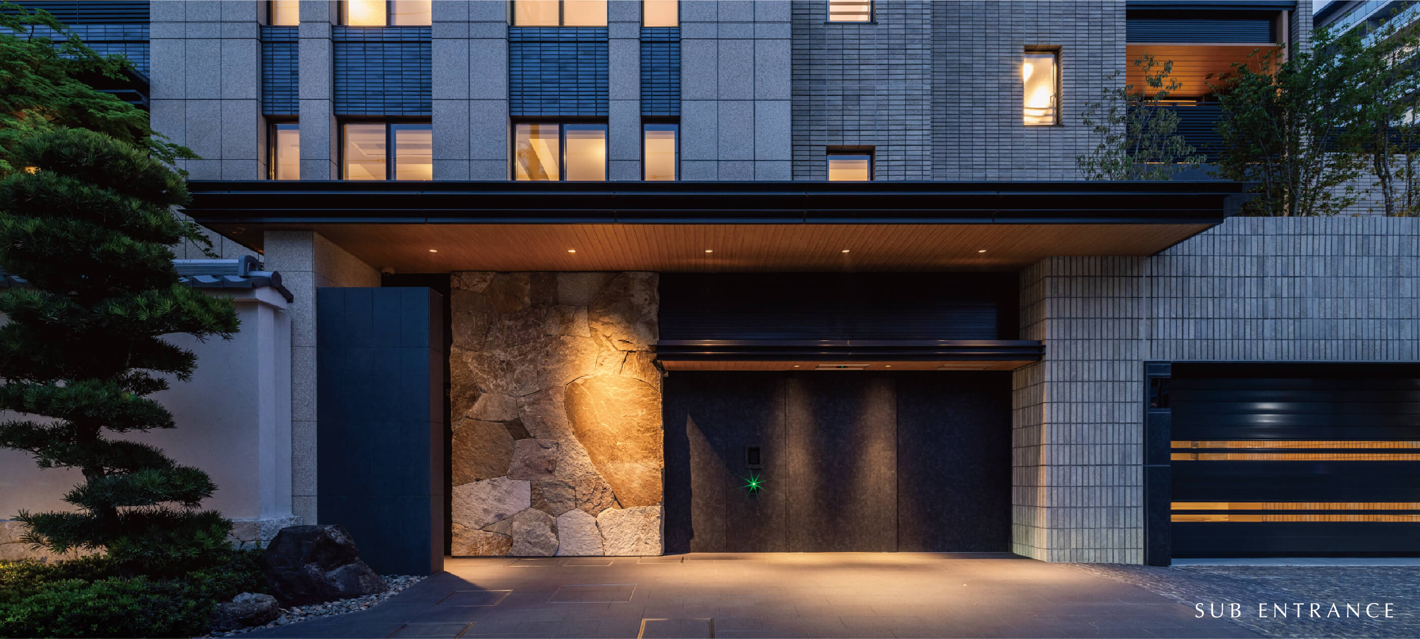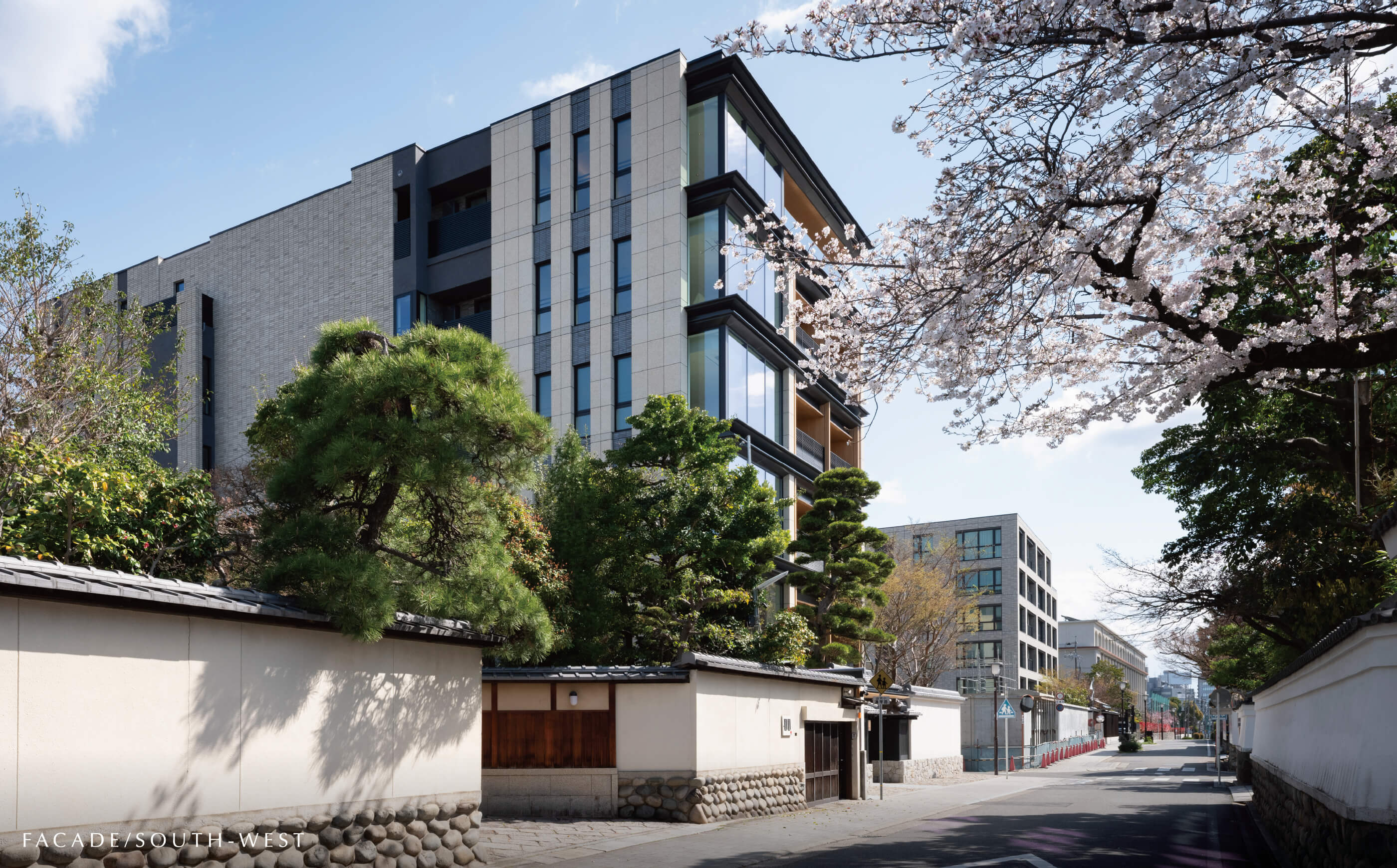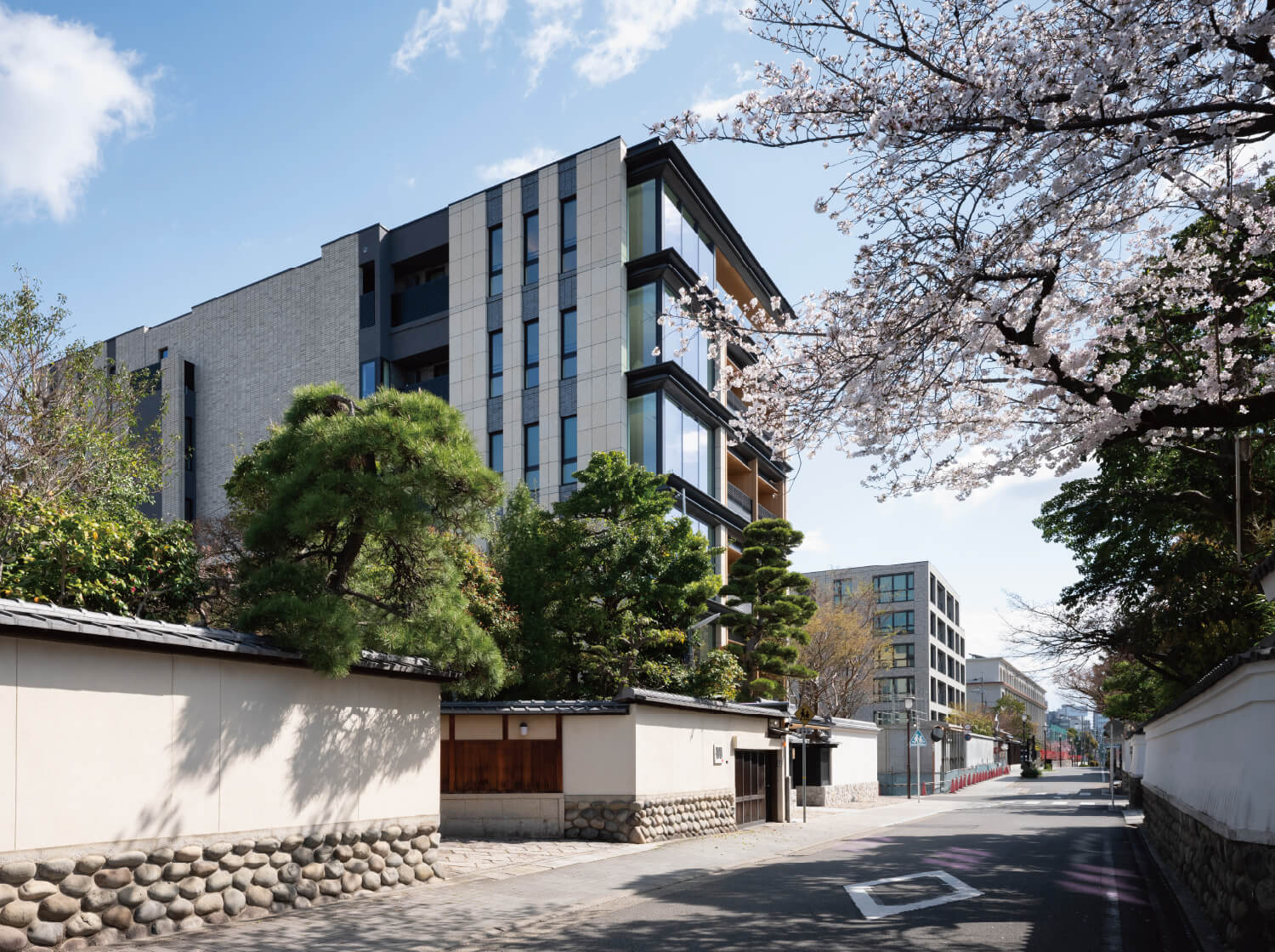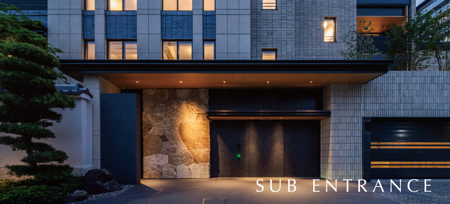白壁の地に次世代に継ぐ新たな景色を生み出すために。武家屋敷の面影をしのぶ、歴史ある門?塀、緑からなる屋敷景観との調和を目指し、庵治石や三州瓦などの伝統素材を現代的ディテールによって再構築。歳月と共に深みを増してゆく、白壁町筋に新たな修景を創造します。
