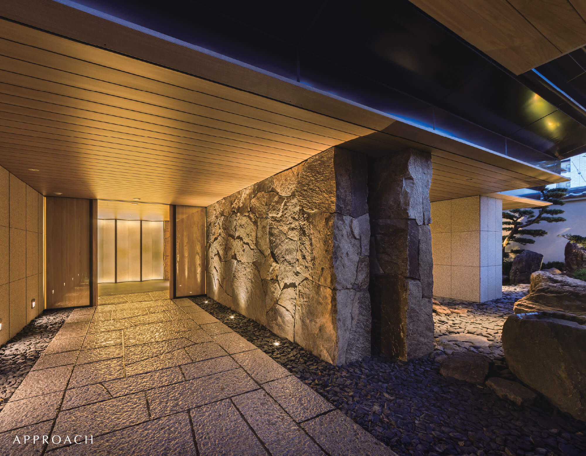 奧深い自然味に溢れる美しい石貼りの意匠。匠の丁寧な手作業により、一枚一枚から優美な表情が漂うタイル。日本の伝統美が織りなすマテリアルは、白壁の歴史景観に調和しながら、さり気なく厳かな存在感を醸しだす。