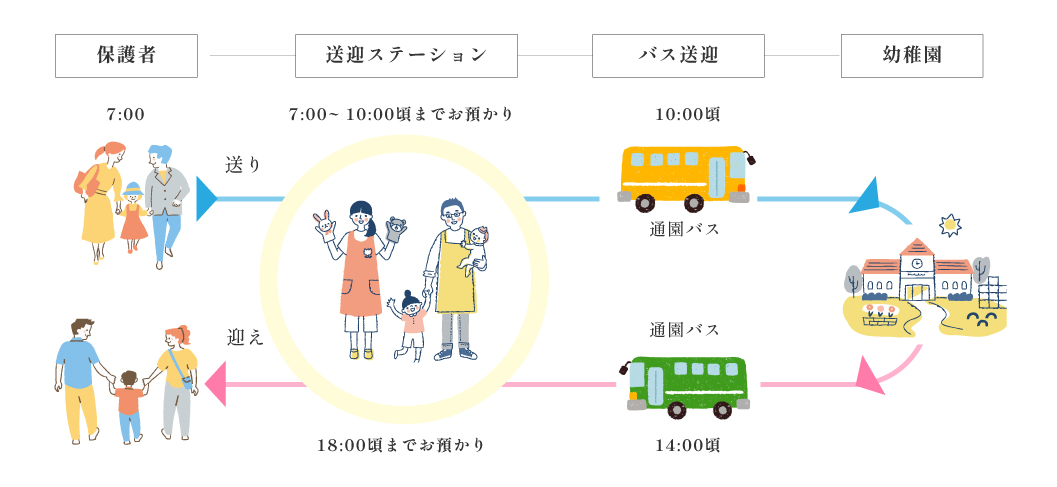 共働きのご家庭をサポートする「送迎ステーション」では、保護者の方が出勤前にお子さまを預け、幼稚園?認定こども園のバスが到著するまでお預かりします。幼稚園の保育が終わるとバスで「送迎ステーション」へ戻り、お迎えまで引き続きお預かり。朝から夕方まで、安心して働ける環境を支えます。