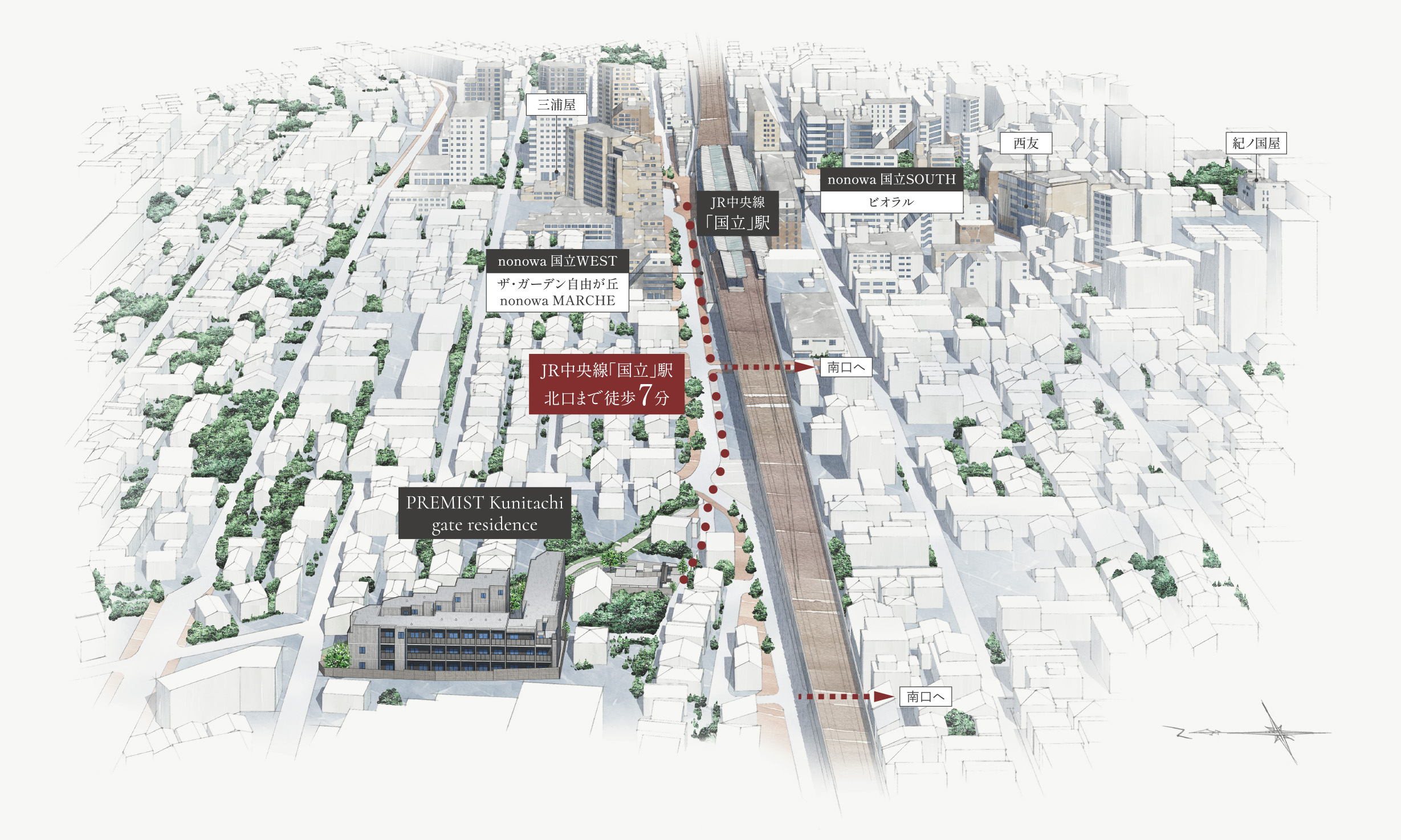 エリア概念イラスト2009年より再開発が行われているJR「國立」駅。2016年4月に「nonowa 國立WEST」が開業(yè)、回遊歩行空間「ののみちクニタチ」が整備されたことで、改札口や高架下エリア、周辺地域への回遊性が向上しました。