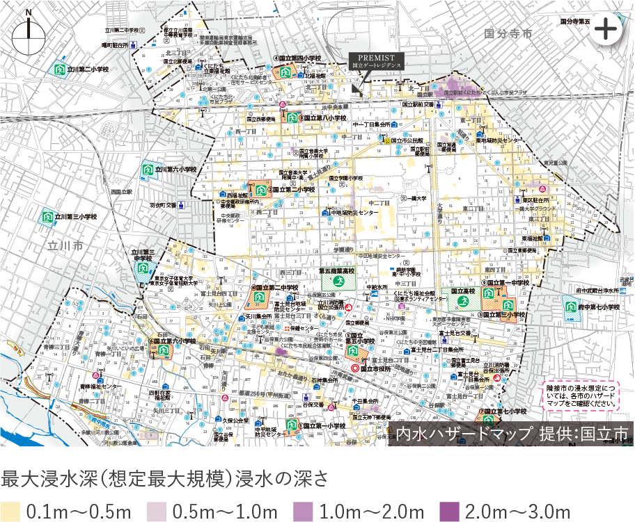 武蔵野臺地上に位置する「プレミスト國立ゲートレジデンス」。ハザードマップでは、洪水?內水、土砂災害のいずれも該當しないエリアであることが確認できます。