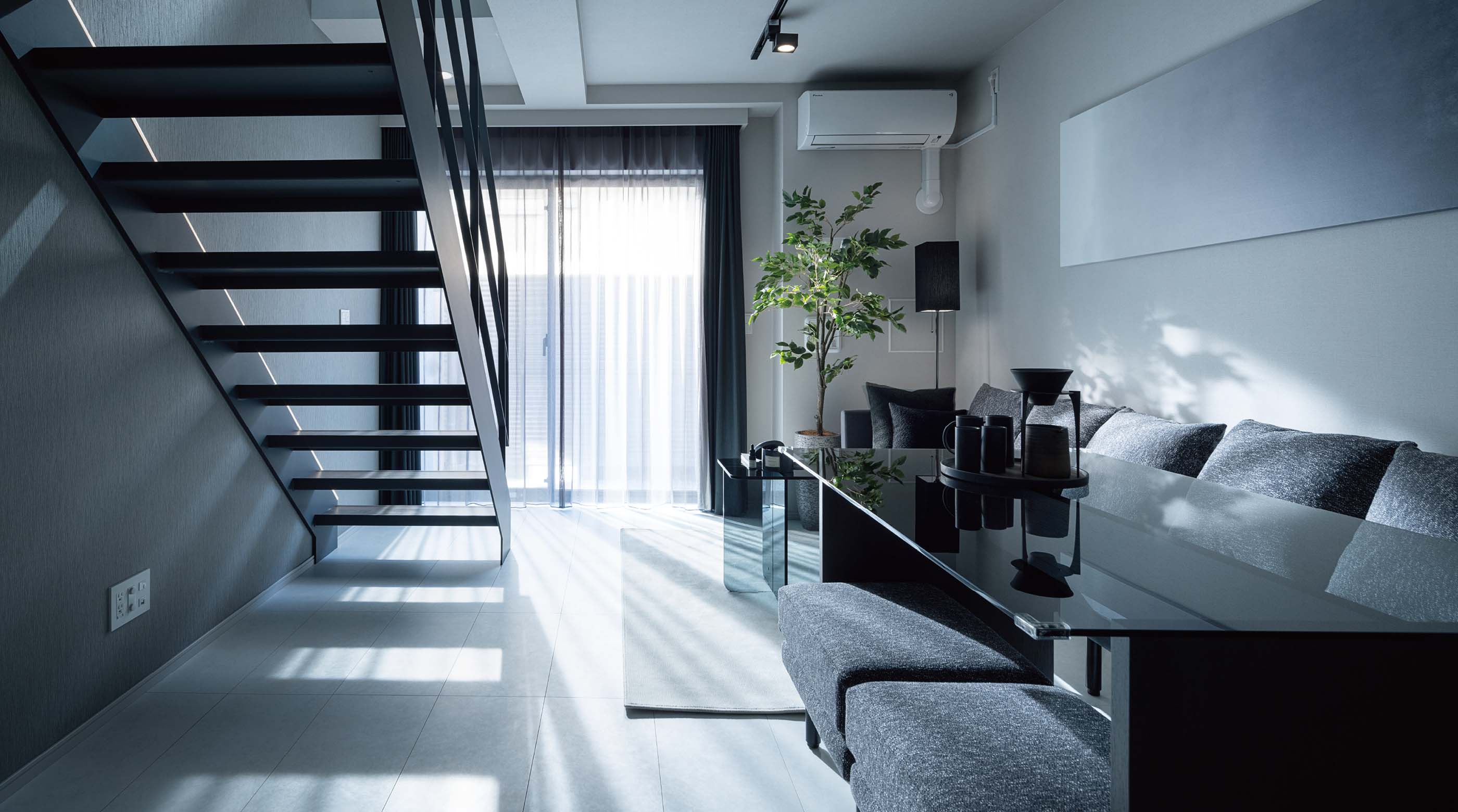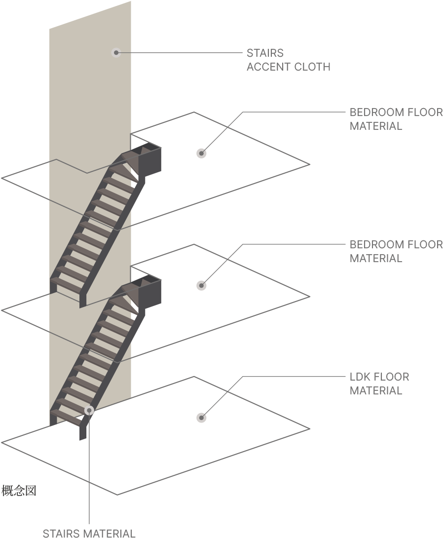 メゾネットプラン概念イラスト(Bタイプ)外観デザインが持つシンプルでモダンな印象を室內(nèi)にも取り入れたインテリアコーディネートを追求。LDK空間は床や壁は薄い色、ドアノブやキッチンの建具など面積の小さいものは濃い色とした濃淡のグラデーションをつくることで、空間の圧迫感を軽減し、自然な広がりを感じさせます。