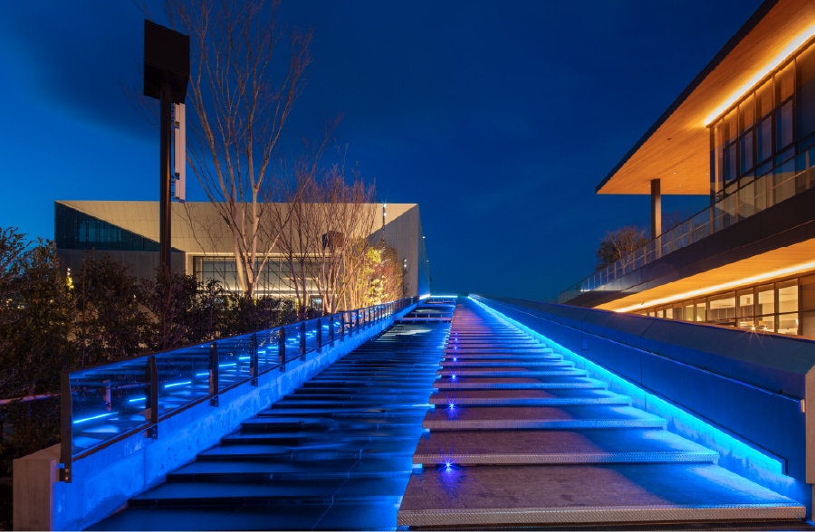 約120mの水の流れる階段「カスケード」を上がると昭和記念公園が一望できるスカイデッキが広がります。