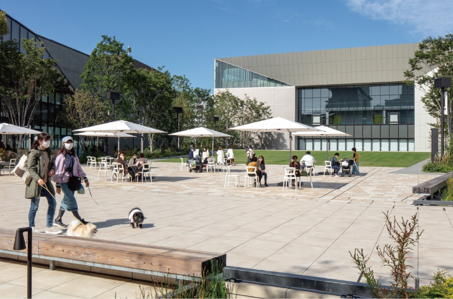 2020年4月に開業したGREEN SPRINGSは、店舗や飲食店が中央広場の緑を囲むように連なり、散歩も楽しめるスポットです。またホテル、イベントホールやオフィスなど多彩な機能を備え、自然と都市が調和した新しい街の景観を創り出しています。