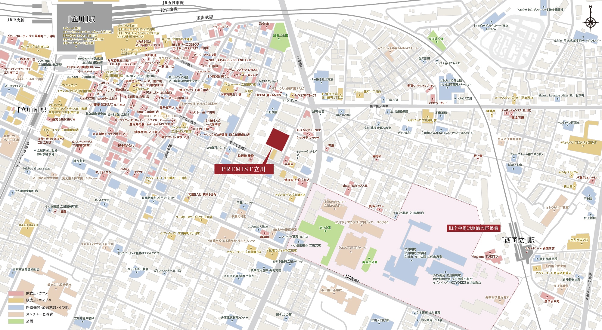 「プレミスト立川」は、「立川」駅南口の商業施設や飲食店で賑わうエリアと落ち著いた住宅街へと変わる中間に位置しています。そのため、利便性と落ち著いた暮らしを両立できる立地です。「立川」駅周辺の生活利便施設はもちろん、「西國立」駅周辺にはサミットや西友など日常使いに便利なスーパーも揃っています。