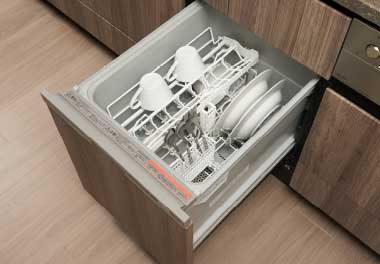 スイッチひとつで洗浄から乾燥まで自動で行い、家事の負擔を減らし、除菌洗浄できる食器洗い乾燥機を採用。