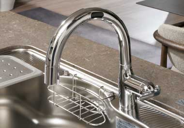 キッチンの水栓は片手で操作でき、引き出してシャワーとしても利用が可能。先端に浄水カートリッジが內蔵できます。