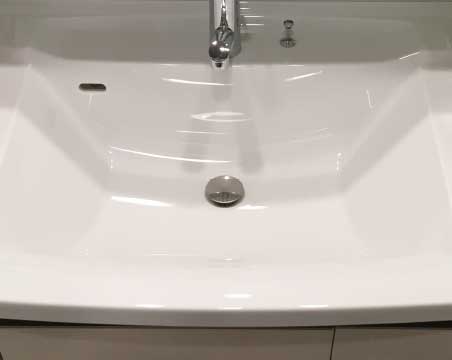 光沢が美しいアクリル100%の人造大理石天板。継ぎ目がなくお手入れが簡単です。