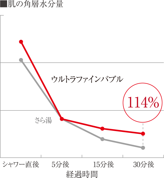 〈実験方法〉シャワーを使用して前腕部に10L/分、20秒の條件で試験水を流水。その後、前腕部の角層水分量を、シャワー直後からシャワー30分後まで経時的に測定。〈実験條件〉試験水:水道水、水溫:40℃、被験者:成人女性16名 早坂信哉,古川真也,松枝和輝:ウルトラファインバブルを含むシャワーの角層水分量?保濕への影響,日本健康開発雑誌,2023,Vol. 44, p. 5560. リンナイ調べ。〈実験方法〉排水管に疑似汚れを溜め、流量7L/分で通水。く実験條件〉試験水:水道水、水溫:40℃、水圧:200kPa、配管長さ:13A-10mの條件で生成したウルトラファインバブル入りの水を使用。リンナイ調べ。