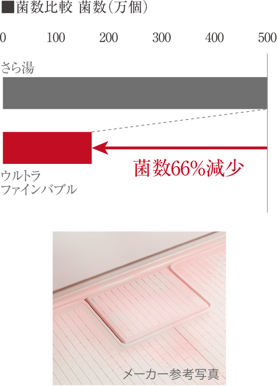さら湯と比べて、ミネラル成分の付著を軽減して水垢を付きづらくし、排水口の汚れも軽減します。
