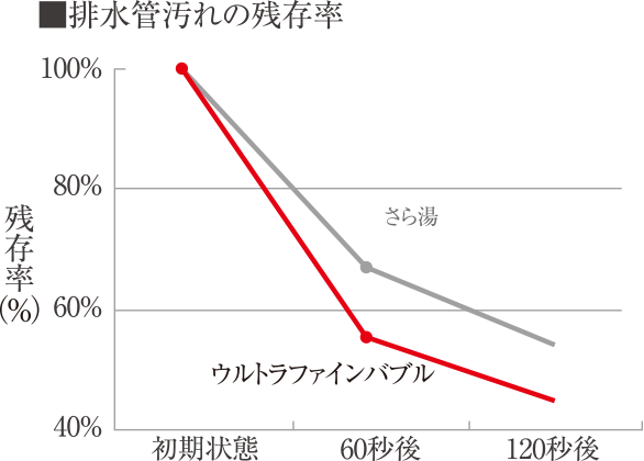 〈実験方法〉排水管に疑似汚れを溜め、流量7L/分で通水。く実験條件〉試験水:水道水、水溫:40℃、水圧:200kPa、配管長さ:13A-10mの條件で生成したウルトラファインバブル入りの水を使用。リンナイ調べ。