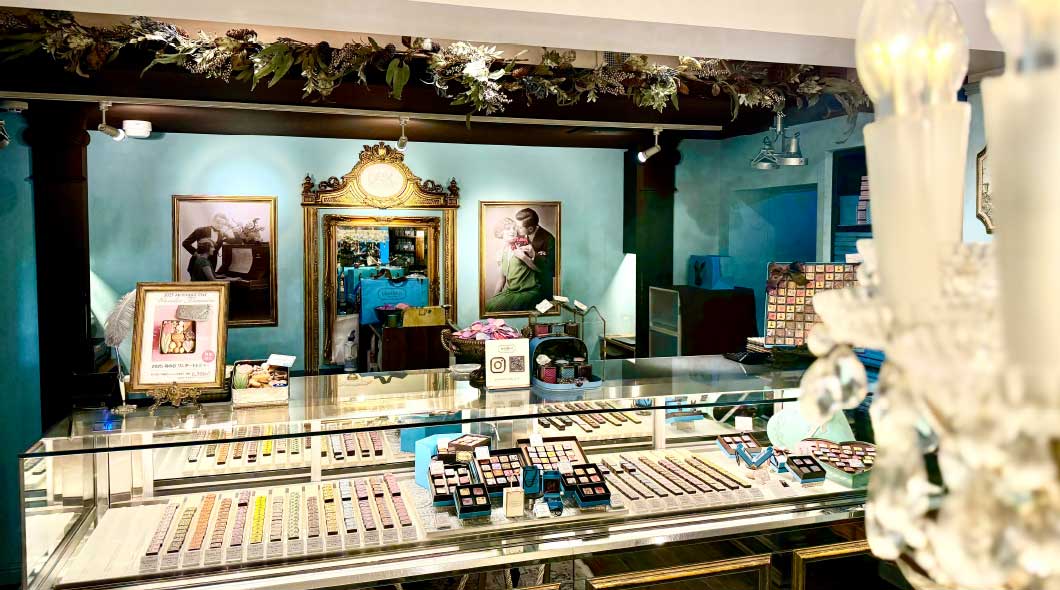 アーティストがデザインしたガナッシュには、一つひとつに物語がある。厳選されたカカオ豆と秘伝のレシピから職人が生み出すのは、濃厚なのに軽やかなチョコレートの世界。古民家を利用した店舗の奧にはカフェスペースも。