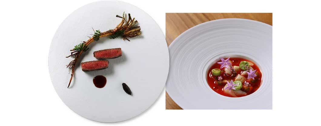 山と海の神々がもたらす旬の食材を自身の目で選び抜き、全國の生産者から取り寄せ仕立てるのはフレンチベースのジャンルレス料理。「心を真っ白に」という想いが込められた華やかなその姿に、六感が反応する。