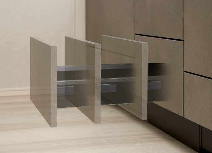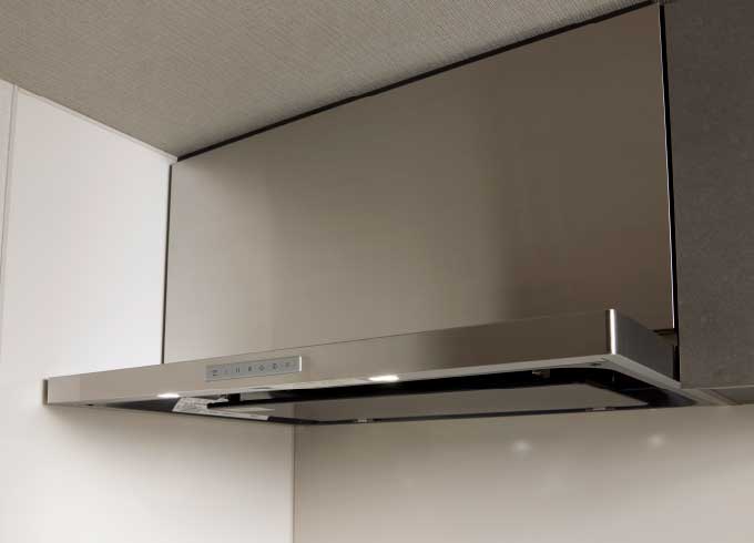 収納物全體を上から見渡せる便利なスライド式収納。ソフトクローズ機能付きでゆっくり靜かに閉まります。足元部分には巾木収納も設けています。