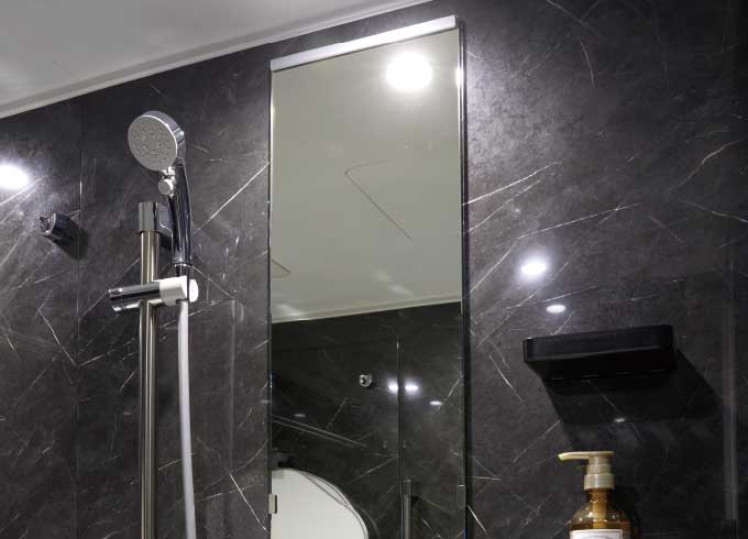 表面を炭素の膜で覆ったお掃除ラクラク鏡。簡単なお手入れで水あかを落とせます。