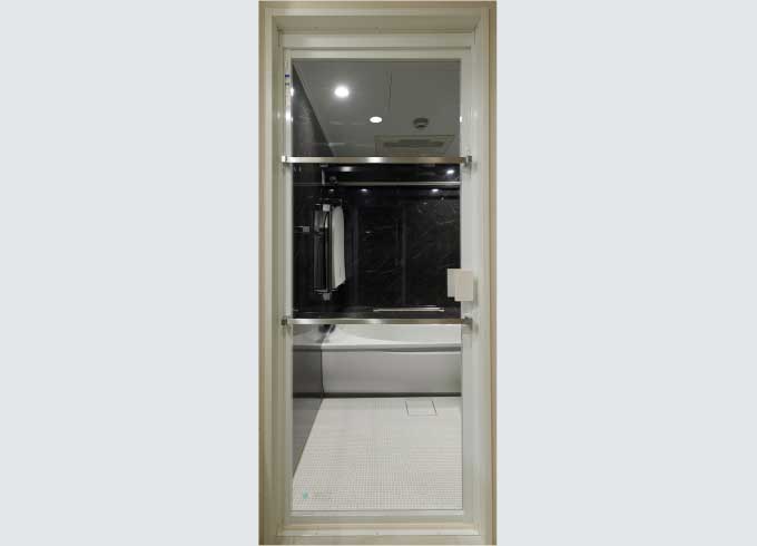 カビが付きやすくお手入れも大変なドア縁のゴムパッキンをなくし、汚れがたまりやすいドア下の換気口をドア枠の上部に移動しました。ドア外にはバスマットとタオルの両方がかけられるよう、タオル掛けを2本設けました。